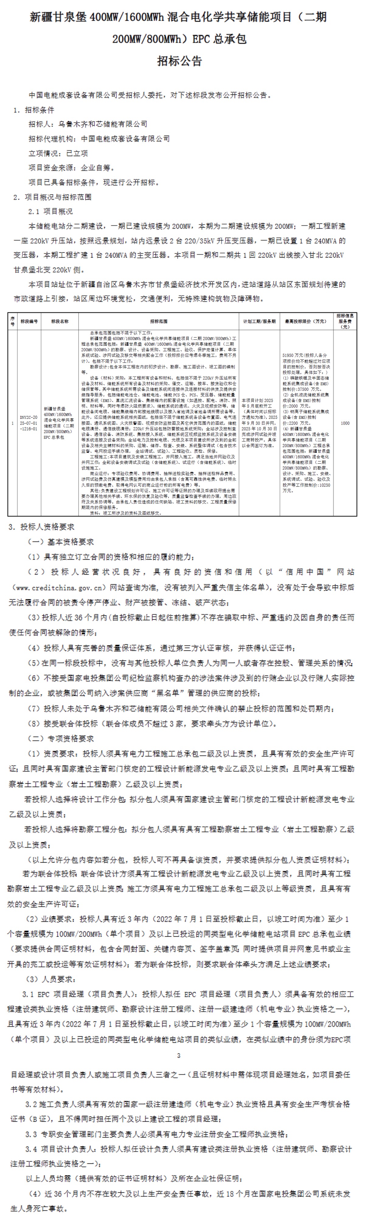 中國儲能網(wǎng)訊:7月31日,新疆甘泉堡400MW/1.6GWh混合電化學(xué)共享儲能項目(二期200MW/800MWh)EPC招標(biāo),項目招標(biāo)人為烏魯木齊和芯儲能有限公司。