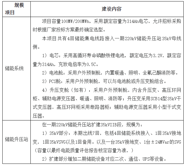 本項目采取總承包交鑰匙方式完成,建設(shè)1座電化學(xué)儲能電站,容量為100MW/200MWh,主要由兩部分組成,分別為儲能系統(tǒng)、儲能220kV升壓站35kV擴建(含二次及通信設(shè)備)等,具體建設(shè)規(guī)模如下:
