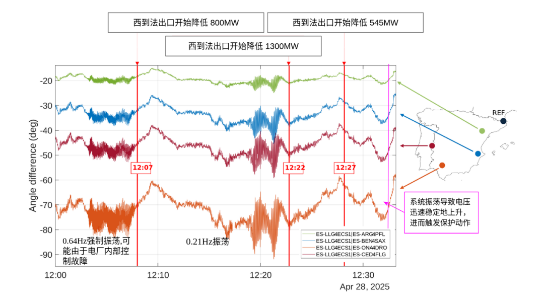 第1階段“系統(tǒng)中的電壓與振蕩”:4月28日12:00-12:30期間,電壓異常升高,進(jìn)而觸發(fā)了頻率的快速下降,隨后產(chǎn)生系統(tǒng)級(jí)別的振蕩(指電力系統(tǒng)中電壓、頻率等各個(gè)變量出現(xiàn)不穩(wěn)定的振蕩現(xiàn)象)。12點(diǎn)03分,記錄到0.64Hz的非典型振蕩(有專家指出由光伏電站引起的強(qiáng)制振蕩,可能是由于內(nèi)部控制故障造成的),持續(xù)4.42分鐘,引起了較大的電壓波動(dòng)。這種振蕩迫使系統(tǒng)運(yùn)營(yíng)商采取協(xié)議措施,增強(qiáng)電網(wǎng)的網(wǎng)狀結(jié)構(gòu)(也就是重新連接10條400kV線路)或減少對(duì)法國(guó)的電力輸送。所有這些動(dòng)作抑制了振蕩,但也產(chǎn)生電壓增加的副作用,使得穩(wěn)定電壓的難度增大。12點(diǎn)16分,再次記錄到相同的振蕩,規(guī)模較小。12點(diǎn)19分時(shí),強(qiáng)迫振蕩以較小幅度激發(fā)了頻率為0.21Hz的東西中區(qū)域間振蕩模式,該模式體現(xiàn)了歐洲電網(wǎng)的典型特性。系統(tǒng)操作員采用相同的措施來緩沖,也使得電壓增加。此外,與法國(guó)的高壓直流連接的聯(lián)絡(luò)線也改為固定功率模式,出口減少到1000兆瓦,這對(duì)抑制振蕩具有顯著效果。但是這樣做的一個(gè)副作用是,即使西班牙在多次發(fā)電中斷后出現(xiàn)巨大電力缺口,也無法改變對(duì)法國(guó)出口變化。為了恢復(fù)電壓,在振蕩過程中電壓瞬時(shí)降至較低值時(shí),采取了并聯(lián)電抗器的操作措施。