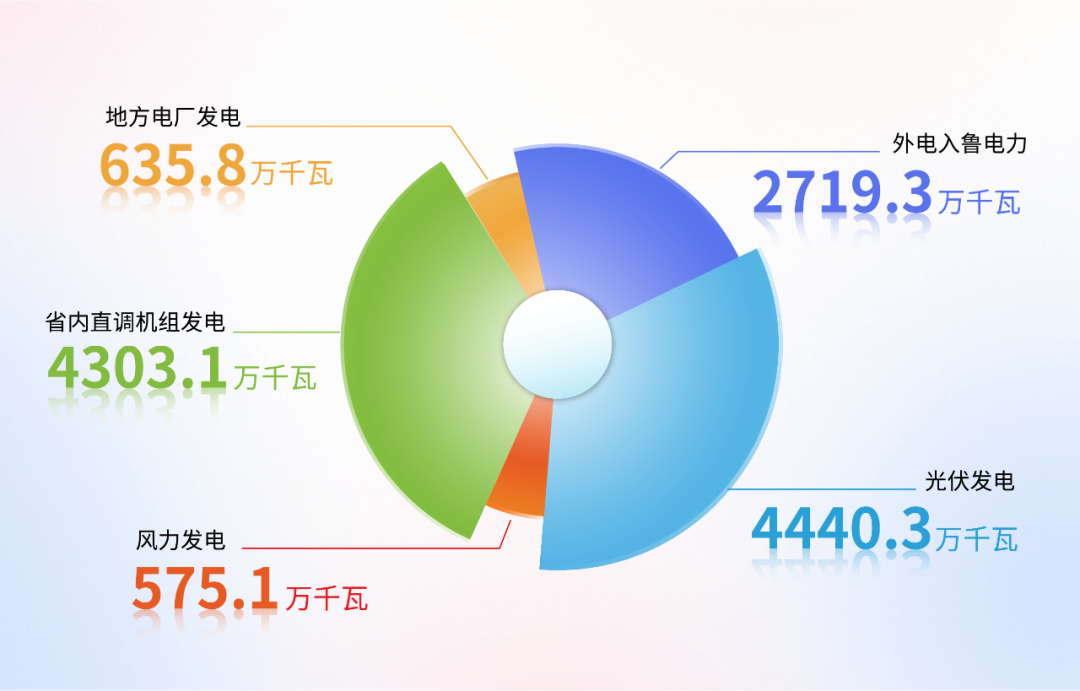 在該時刻,外電入魯電力達2719.3萬千瓦,風(fēng)光新能源合計5015.4萬千瓦(風(fēng)電575.1萬千瓦、光伏發(fā)電4440.3萬千瓦),省內(nèi)直調(diào)機組發(fā)電出力合計4303.1萬千瓦,地方電廠發(fā)電出力合計635.8萬千瓦。
