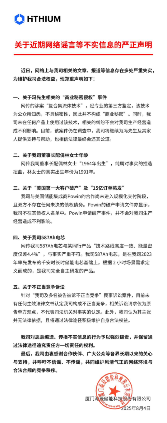 8月4日晚間,海辰儲(chǔ)能通過(guò)官方渠道發(fā)布《關(guān)于近期網(wǎng)絡(luò)謠言等不實(shí)信息的嚴(yán)正聲明》,針對(duì)“商業(yè)秘密侵權(quán)”“美國(guó)第一大客戶(hù)破產(chǎn)”“不正當(dāng)競(jìng)爭(zhēng)訴訟”等五大網(wǎng)絡(luò)謠言逐一辟謠,強(qiáng)調(diào)涉案技術(shù)不具秘密性、訂單未受影響,并重申587Ah電芯為自主研發(fā)產(chǎn)品。