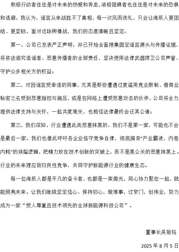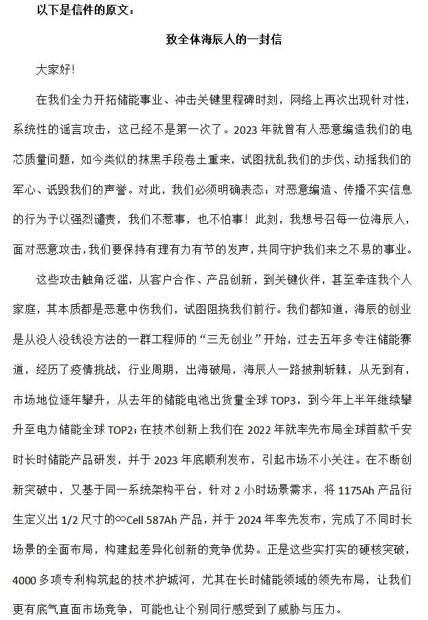聲明發(fā)布僅24小時(shí)后,8月5日晚間,海辰儲(chǔ)能創(chuàng)始人、董事長(zhǎng)吳祖鈺(Jeff)向全體員工群發(fā)《致全體海辰人的一封信》,以“我們不惹事,也不怕事”的強(qiáng)硬態(tài)度,回應(yīng)近期輿情攻擊。