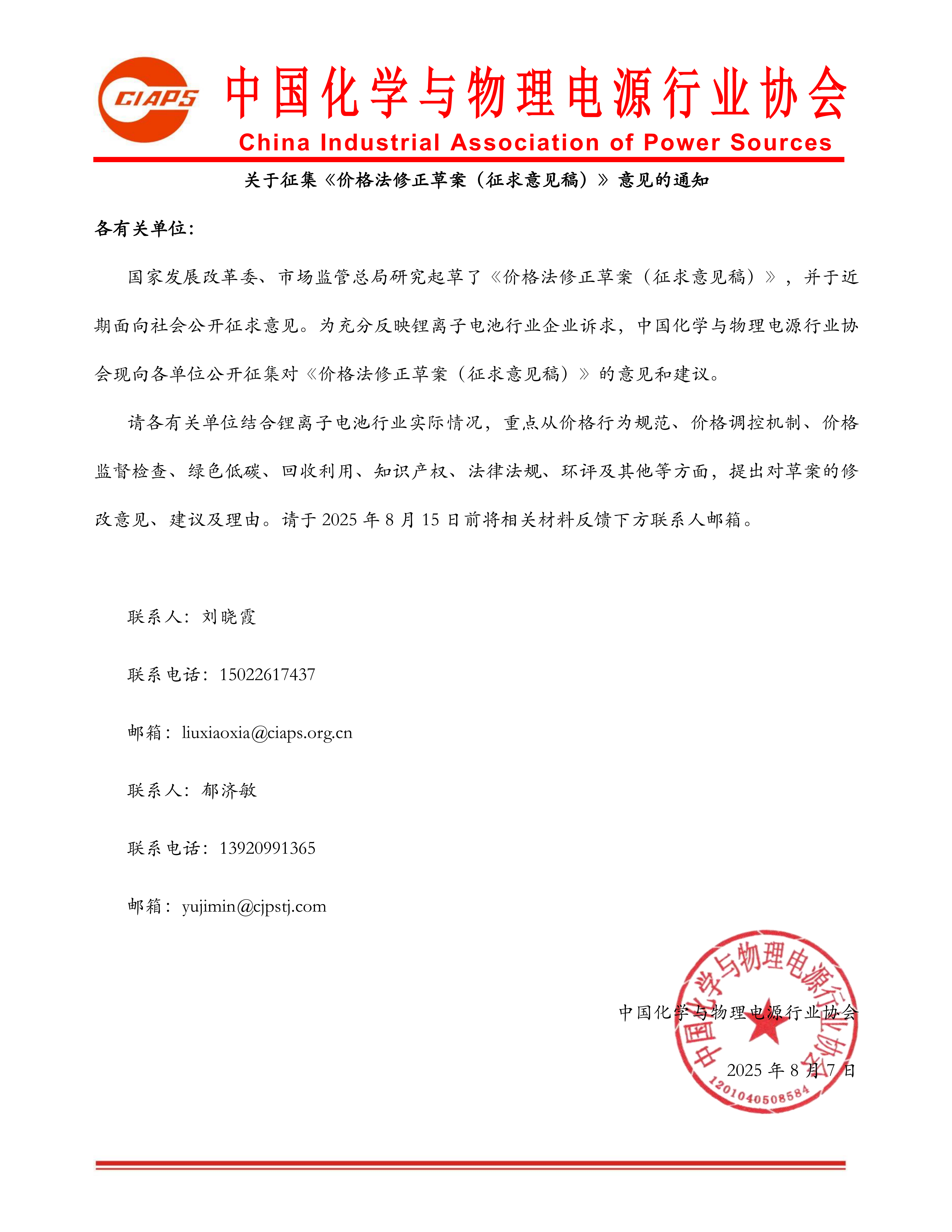 請各有關(guān)單位結(jié)合鋰離子電池行業(yè)實(shí)際情況,重點(diǎn)從價(jià)格行為規(guī)范、價(jià)格調(diào)控機(jī)制、價(jià)格監(jiān)督檢查、綠色低碳、回收利用、知識產(chǎn)權(quán)、法律法規(guī)、環(huán)評及其他等方面,提出對草案的修改意見、建議及理由。請于2025年8月15日前將相關(guān)材料反饋至下方聯(lián)系人郵箱。