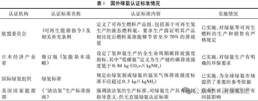 國外對綠氨的認證標準已經相對成熟,并且不同國家和地區(qū)根據其自身的環(huán)保政策、技術水平和市場需求,制定了相應的綠氨認證標準。尚未形成統(tǒng)一的國家標準,但有團體標準或行業(yè)標準在探討和實施中,如中國氮肥工業(yè)協(xié)會已正式啟動《綠色合成氨分級標準》的編制工作。對國外綠氨認證標準的歸納和分析見表1。