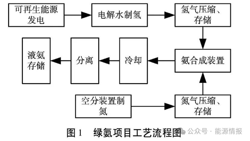 綠氨生產的核心環(huán)節(jié)包括綠氫制備、氮氣制備和合成氨。其中,綠氫制備主要通過電解水制得,氮氣則通過空氣分離設備從空氣中提取。合成氨環(huán)節(jié)則采用傳統(tǒng)的Haber-Bosch法或其他改進工藝。具體見圖1。
