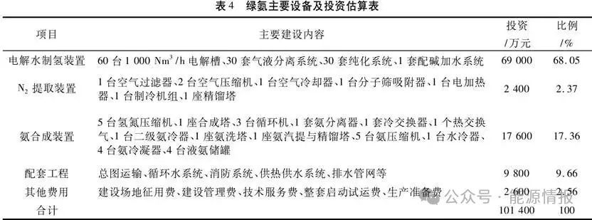 電解水制氫規(guī)模為60000Nm3/h,設備配置方案為:電解槽單臺1000Nm3/h,氣液分離單套2000Nm3/h,純化系統(tǒng)單套2000Nm3/h。即30臺電解槽配套15套氣液分離系統(tǒng)和15套純化系統(tǒng)。氮氣提純裝置規(guī)模為20000Nm3/h,采用變壓吸附氣體分離技術,N2濃度≥99%,主要設備包括:空氣過濾器、空氣壓縮機、空氣冷卻器、分子篩吸附器、精餾塔等設備。氨合成采用哈伯-博世鐵基催化劑技術路線,液氨品質滿足國標(GB536)要求,主要設備包括壓縮機、合成塔、冷卻器、精餾塔、循環(huán)機等化工常規(guī)設備。綠氨主要設備及投資估算見表4。