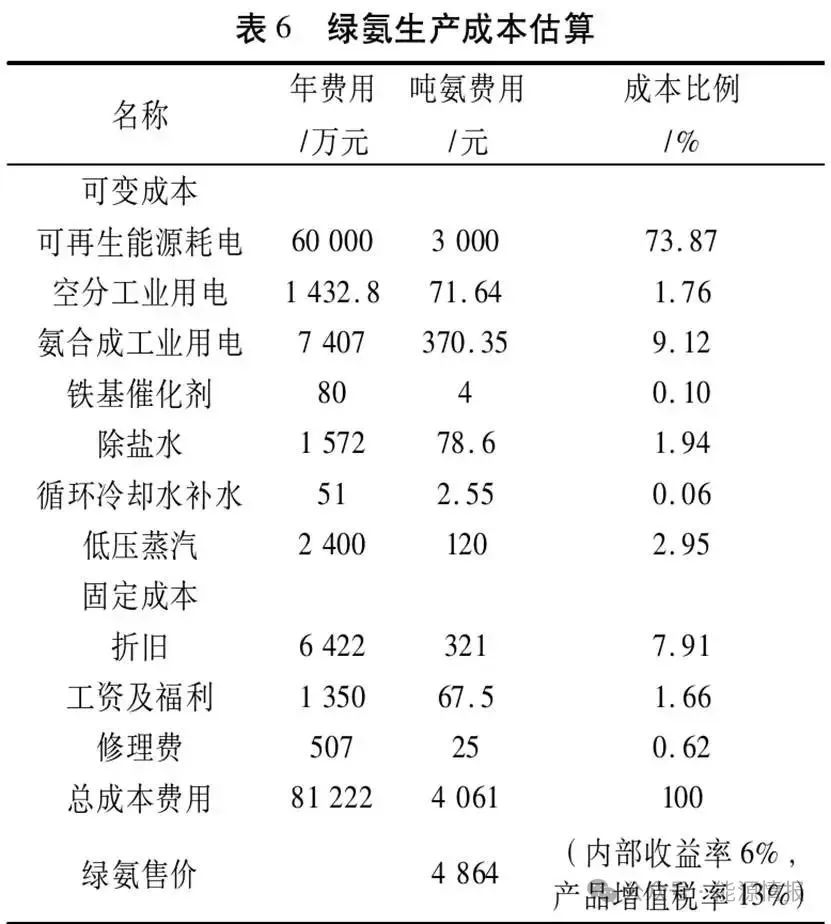 生產運行的假定條件如下:可再生能源電價0.3元/(kW·h);工業(yè)用電價格0.5元/(kW·h);鐵基催化劑價格40元/kg;除鹽水價格6元/t;循環(huán)冷卻水價格0.1元/t;蒸汽價格120元/t;定員90人,年人均工資150000元;內部收益率6%,產品增值稅率13%。工程消耗單價可得的生產成本如表6所示。