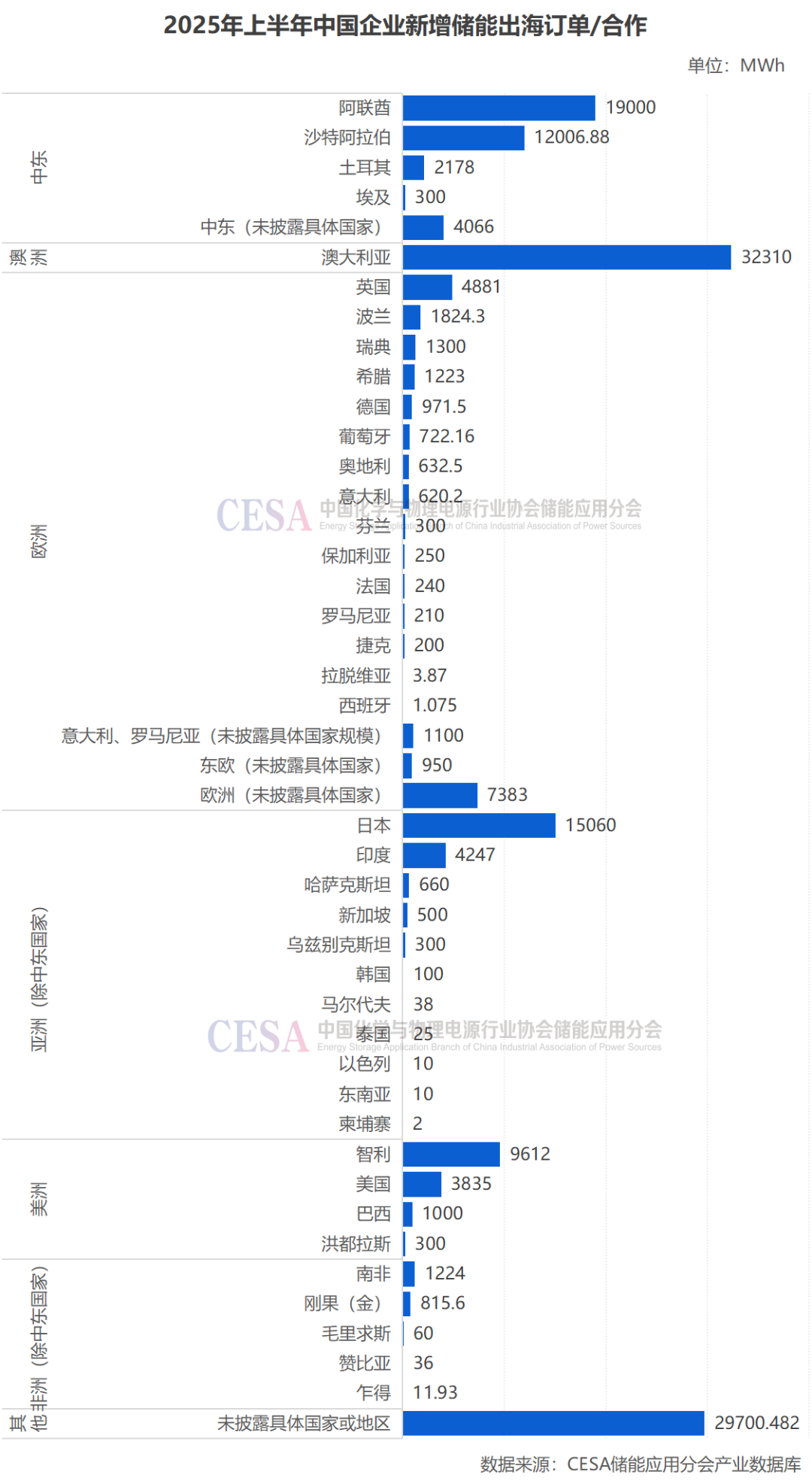 據(jù)CESA儲能應(yīng)用分會產(chǎn)業(yè)數(shù)據(jù)庫不完全統(tǒng)計,2025年上半年,中國企業(yè)新獲199個海外儲能訂單,總規(guī)模160.22GWh,同比+220.28%,其中中東37.55GWh,澳大利亞32.31GWh,歐洲22.81GWh,三大市場訂單體量均已經(jīng)超越美國,成為中國企業(yè)出海的主要目的地。