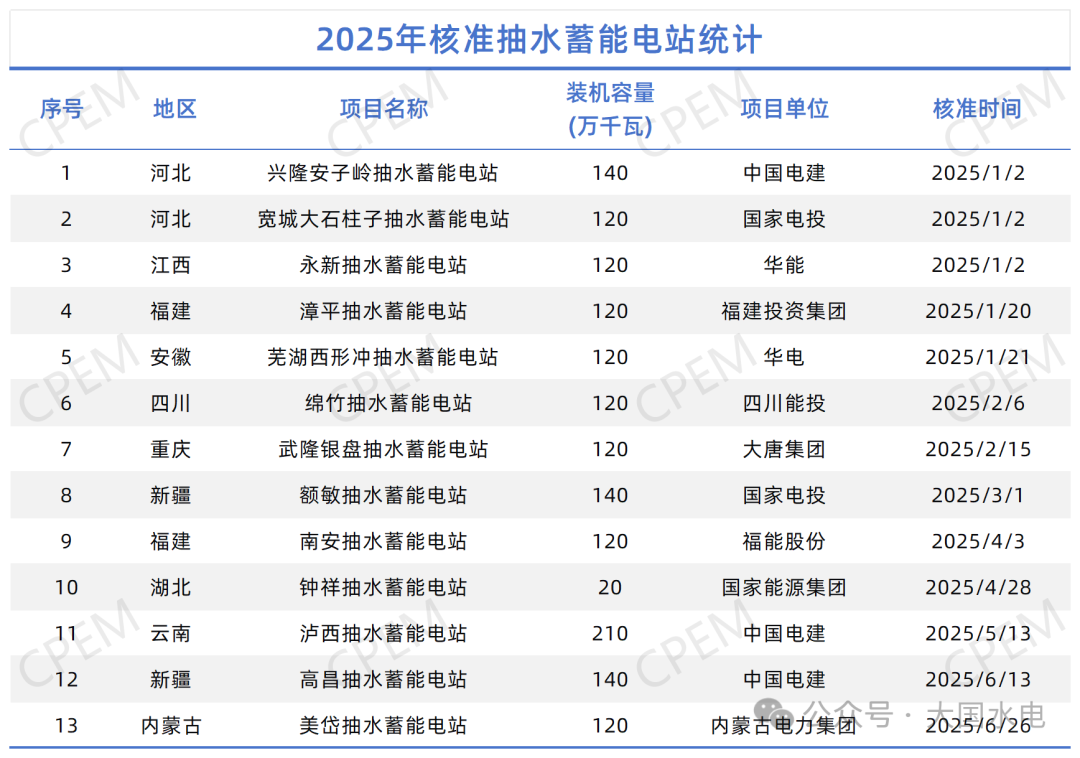 中國儲能網(wǎng)訊:2025年1-7月,一批抽水蓄能電站項目迎來新進展,據(jù)CPEM大國水電統(tǒng)計,截至2025年8月8日,共有13座抽水蓄能電站項目獲核準批復(fù)。