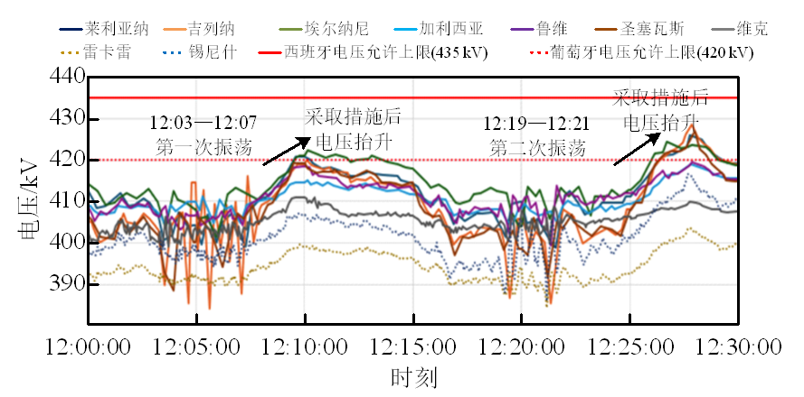 2)區(qū)域低頻振蕩問題長期存在,安全隱患沒有徹底消除。在10:30-11:23之間,半島內(nèi)出現(xiàn)了3次幅值較小、主頻率為0.21Hz的振蕩,歐洲早在2016年就發(fā)生過0.21Hz的典型區(qū)域振蕩模式,說明歐洲電網(wǎng)一直未能徹底根除該隱患。12:19出現(xiàn)幅值較大的0.21Hz振蕩后,系統(tǒng)操作員繼續(xù)按規(guī)程采取了提高阻尼的措施,再次推高了系統(tǒng)的運行電壓。兩次振蕩抑制措施的疊加,使系統(tǒng)電壓運行在安全邊界,為后續(xù)電源連鎖脫網(wǎng)埋下隱患。