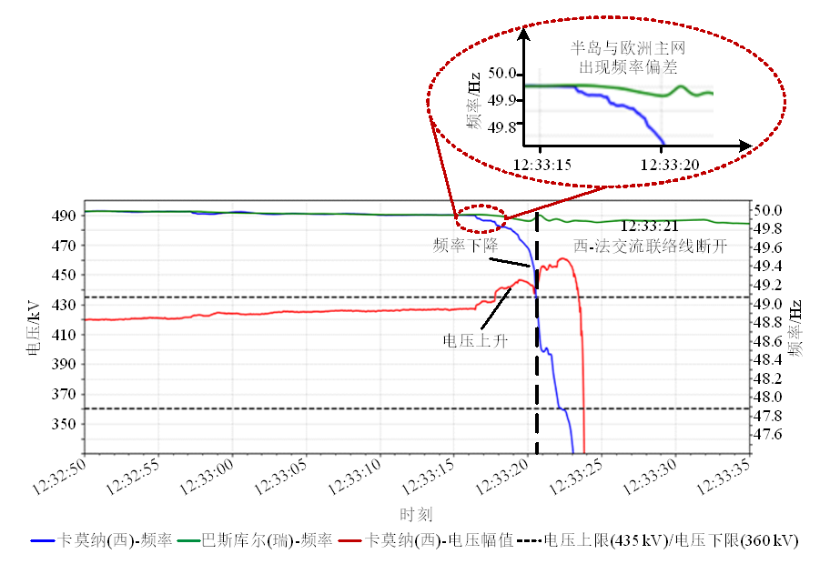 12:33:24,半島電網(wǎng)崩潰,西班牙和法國之間的高壓直流輸電線路停止運行;12:33:27,400kV電網(wǎng)電壓降至1kV以下,半島進(jìn)入全網(wǎng)大停電狀態(tài)。