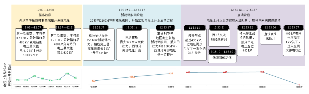 12:32:57、12:33:16和12:33:17,在格拉納達(dá)、巴達(dá)霍斯和塞維利亞地區(qū)觀察到多次電源脫網(wǎng),初步估計發(fā)電損失2.2GW,主要為新能源;由于上述事件,西班牙境內(nèi)電壓再度升高,并帶動葡萄牙電壓同步上升。