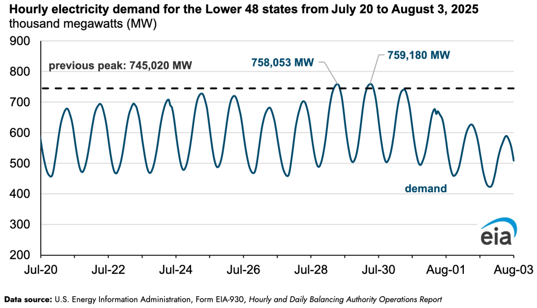 炎熱天氣(推高制冷用電需求)疊加電力需求本身的持續(xù)增長,使得本土48州的“同時峰值需求”于東部時間7月28日18:00-19:00達到758,053兆瓦(MW),創(chuàng)下新高。次日(7月29日),峰值需求再次刷新紀錄,達到759,180 MW,比2024年7月15日創(chuàng)下的745,020 MW原紀錄還高1.9%。