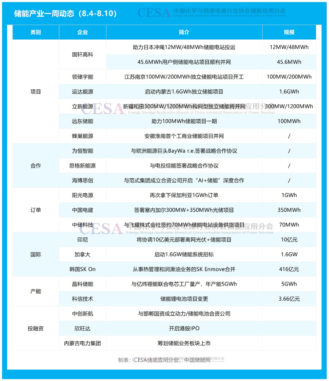 項目方面,立新能源新疆和田300MW/1200MWh構(gòu)網(wǎng)型獨立儲能將并網(wǎng);領(lǐng)儲宇能江蘇南京100MW/200MWh獨立儲能電站項目開工;國軒高科45.6MWh用戶側(cè)儲能電站項目順利并網(wǎng);運達能源啟動內(nèi)蒙古1.6GWh獨立儲能項目;蜂巢能源安徽淮南首個工商業(yè)儲能項目并網(wǎng)。