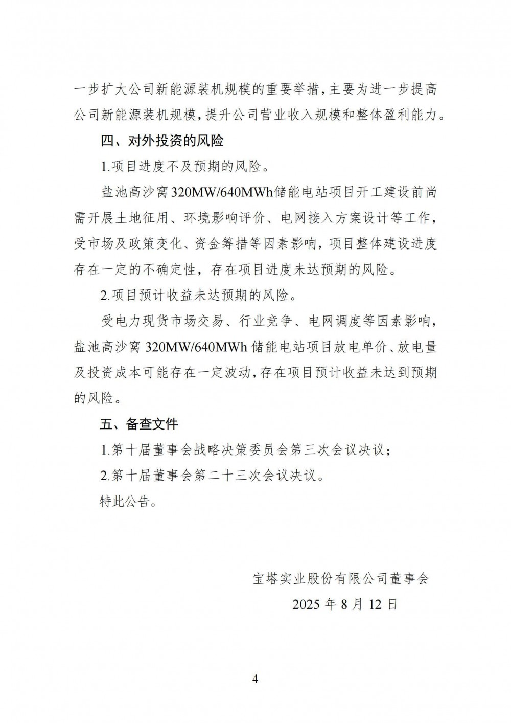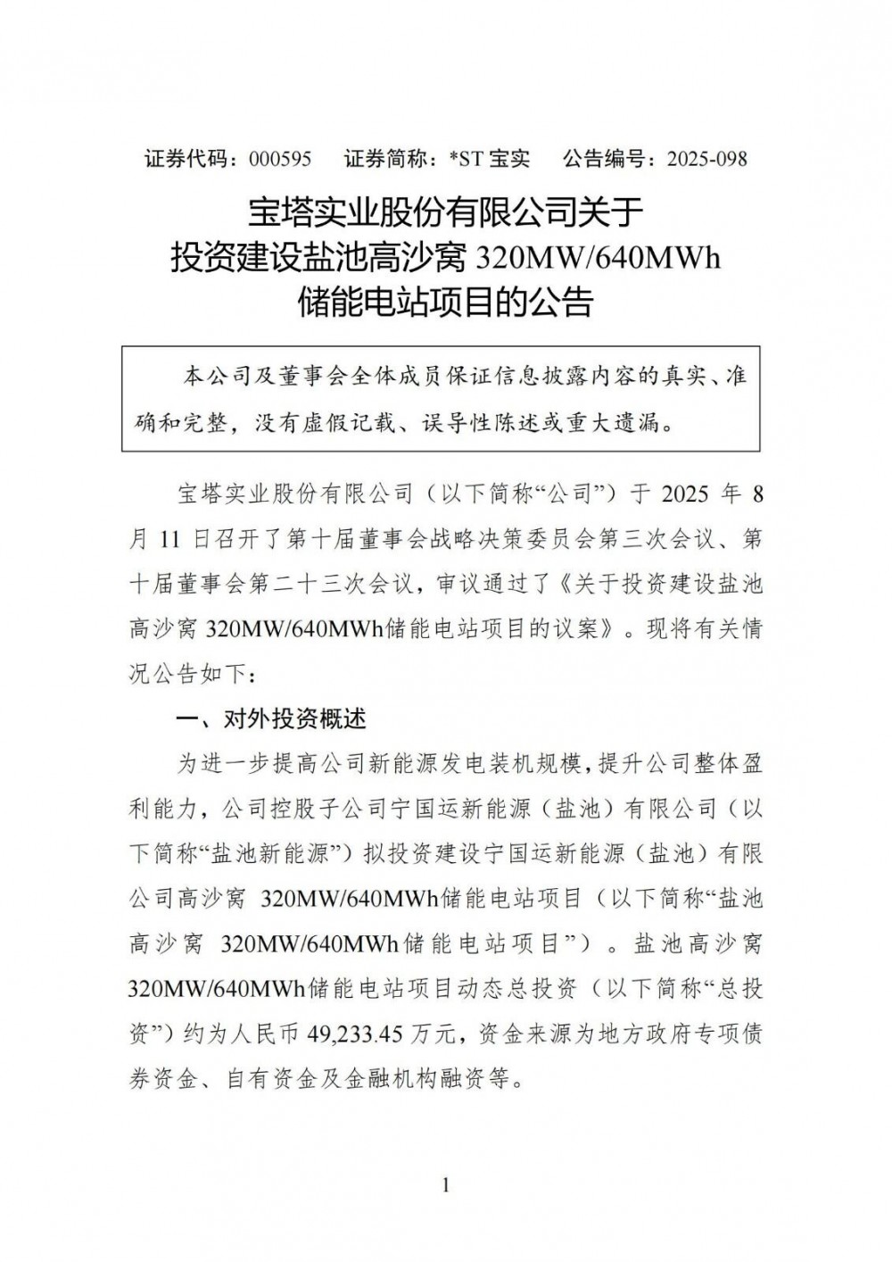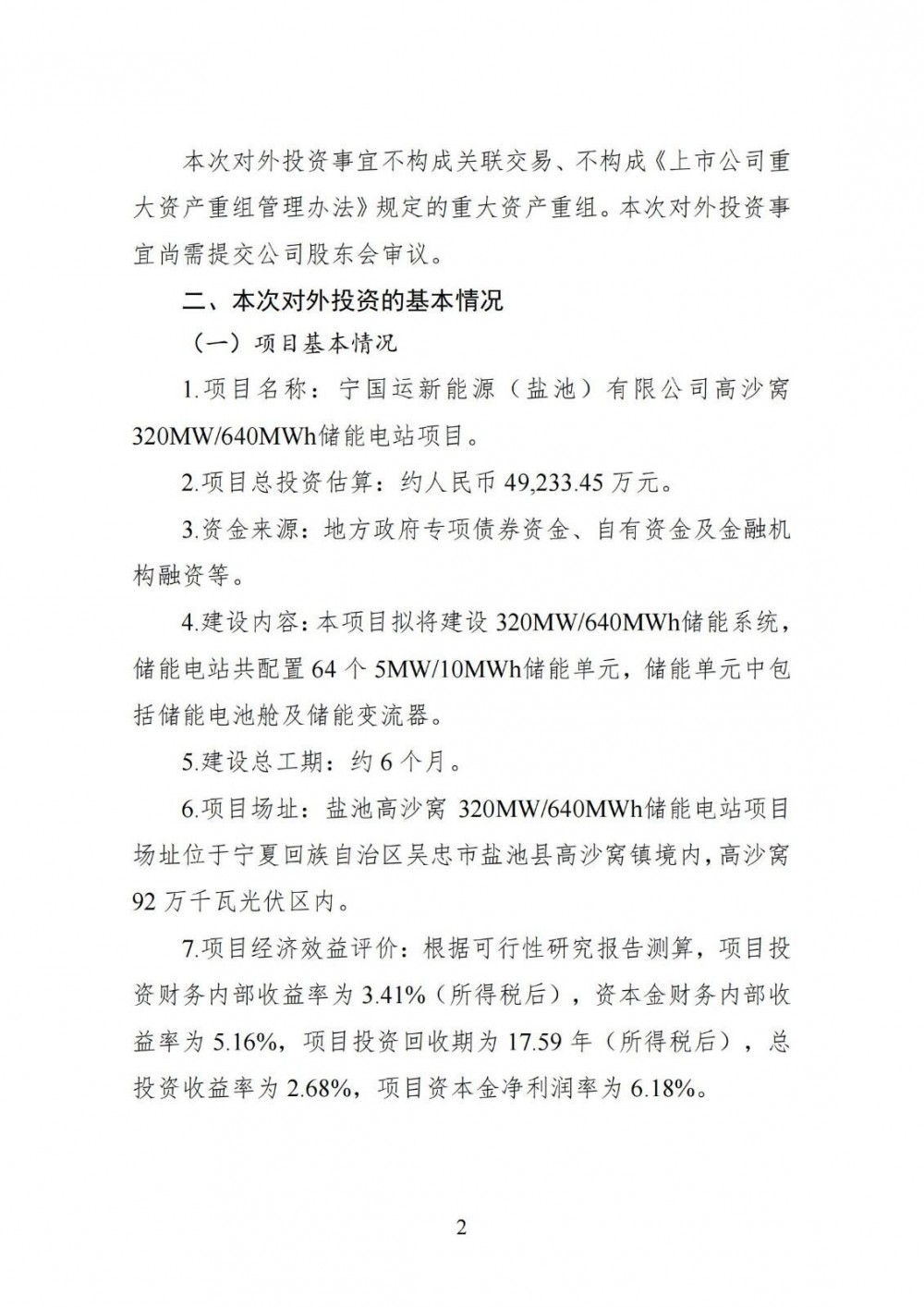 中國儲能網(wǎng)訊:8月12日,寶塔實業(yè)發(fā)布公告稱,為進(jìn)一步提高公司新能源發(fā)電裝機(jī)規(guī)模,提升公司整體盈利能力,公司控股子公司寧國運(yùn)新能源(鹽池)有限公司擬投資建設(shè)寧國運(yùn)新能源(鹽池)有限公司高沙窩320MW/640MWh儲能電站項目。鹽池高沙窩320MW/640MWh儲能電站項目動態(tài)總投資(以下簡稱“總投資”)約為人民幣49,233.45萬元,資金來源為地方政府專項債券資金、自有資金及金融機(jī)構(gòu)融資等。