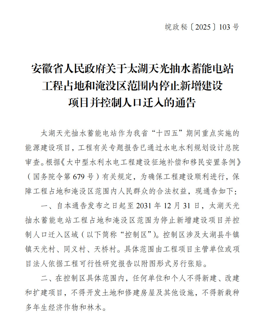 2025年8月11日,安徽省人民政府印發(fā)通告,要求在太湖天光抽水蓄能電站工程占地和淹沒(méi)區(qū)范圍內(nèi)停止新增建設(shè)項(xiàng)目、控制人口遷入規(guī)模,此舉標(biāo)志項(xiàng)目進(jìn)入征地移民實(shí)質(zhì)階段,為后續(xù)建設(shè)鋪路。