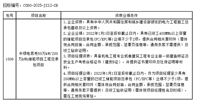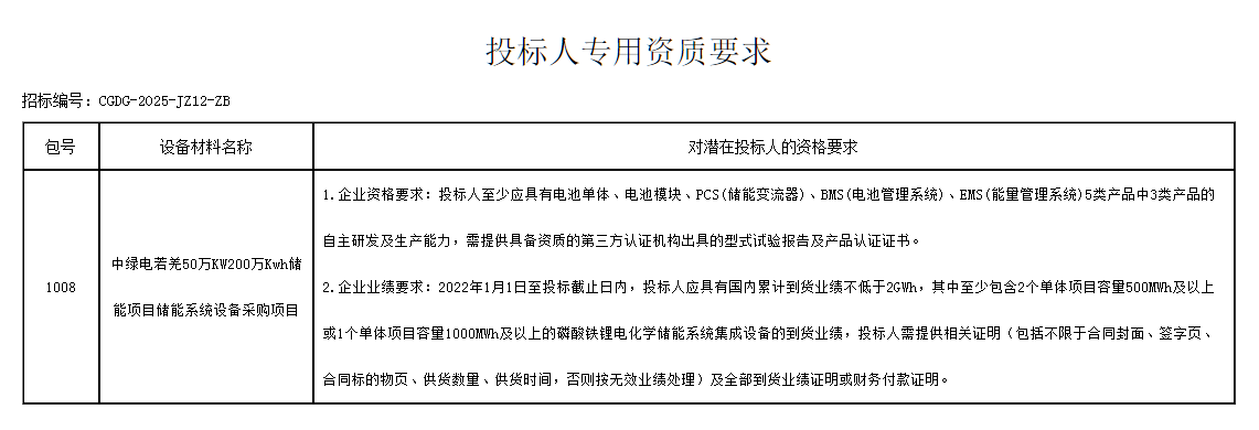 其中儲能系統(tǒng)采購要求交貨時間為2025年10月30日前全部到貨,以買方下達(dá)的采購訂單約定為準(zhǔn)。要求投標(biāo)人應(yīng)具有國內(nèi)累計到貨業(yè)績不低于2GWh,其中至少包含2個單體項目容量500MWh及以上或1個單體項目容量1GWh及以上的磷酸鐵鋰電化學(xué)儲能系統(tǒng)集成設(shè)備的到貨業(yè)績。
