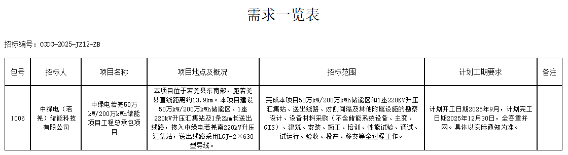 中國儲能網(wǎng)訊:8月11日,中國綠發(fā)投資集團(tuán)發(fā)布中綠電若羌500MW/2000MWh儲能項目EPC及儲能系統(tǒng)設(shè)備采購招標(biāo)。