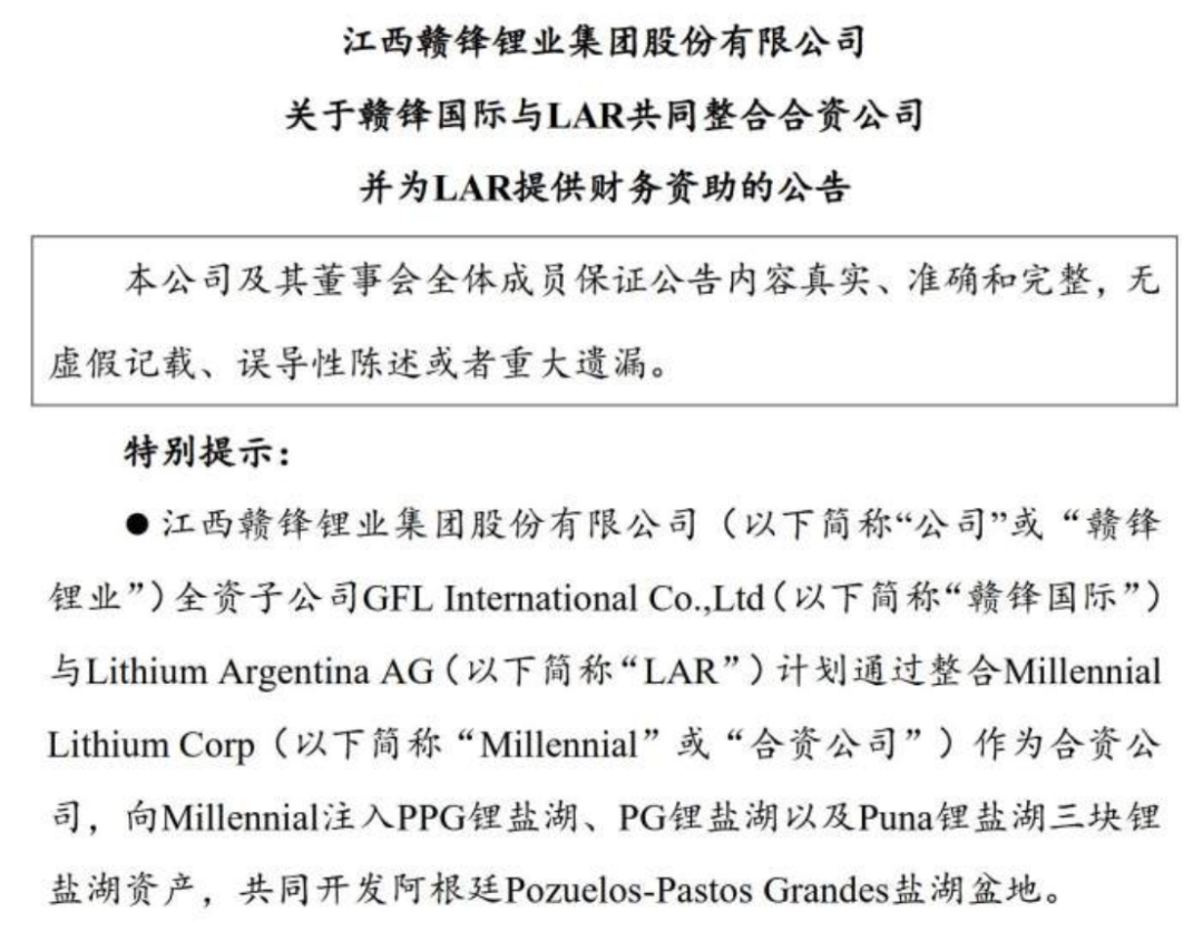 按照公告顯示,贛鋒鋰業(yè)全資子公司贛鋒國際將全資持有的PPG鋰鹽湖項目、與LAR雙方共同持有的PG鋰鹽湖項目(贛鋒鋰業(yè)持有14.89%股權,LAR持有85.11%股權)及Puna鋰鹽湖項目(贛鋒鋰業(yè)持有35%股權,LAR持有65%股權)整合至LAR的全資子公司Millennial旗下,三個鋰鹽湖項目區(qū)域位置接近,是著名的“鋰三角”地區(qū)的一部分,通過整合能夠更進一步地降低成本,做相應開發(fā)。
