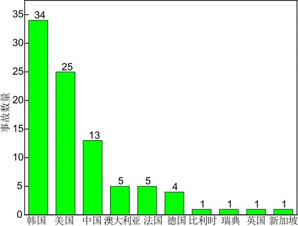 圖4 各國(guó)電化學(xué)儲(chǔ)能電站發(fā)生事故數(shù)量