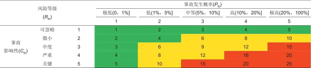 Pf0為事故發(fā)生概率,可從事故案例統(tǒng)計(jì)結(jié)果獲取數(shù)據(jù),接著,通過(guò)公式(2)計(jì)算出風(fēng)險(xiǎn)值Rf0,最后,根據(jù)計(jì)算出的風(fēng)險(xiǎn)值從表6中查出對(duì)應(yīng)的風(fēng)險(xiǎn)等級(jí)。