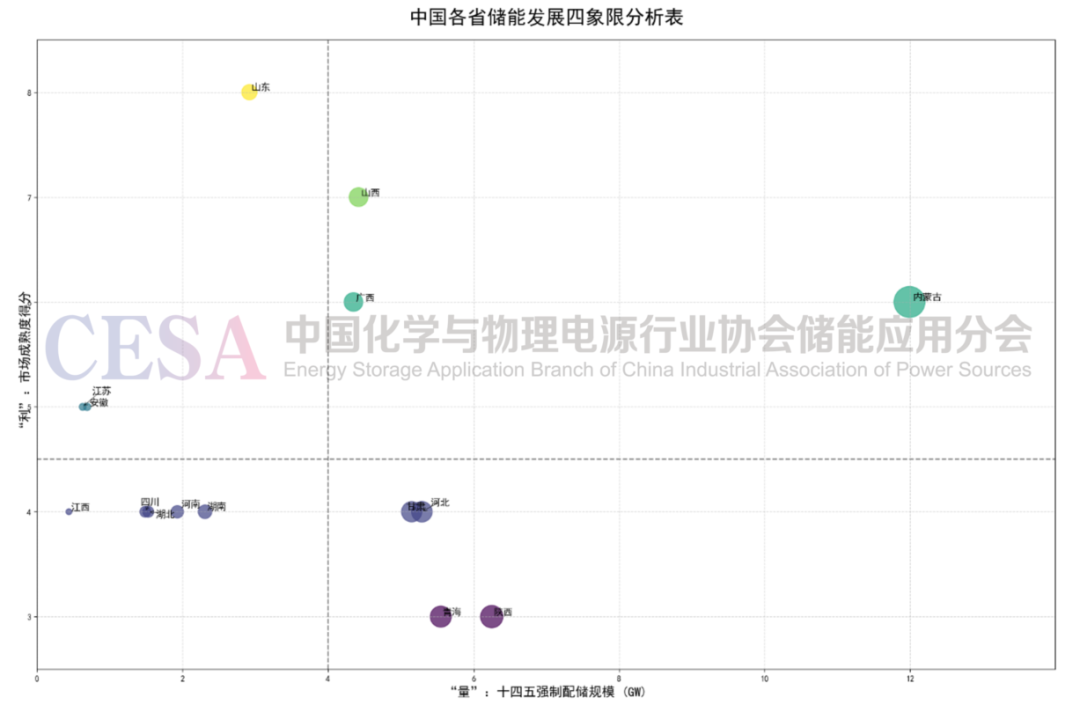 我們將各省份置于一個(gè)以“強(qiáng)制配儲規(guī)模 (GW)”為X軸,以“市場成熟度得分”為Y軸的四象限圖中。我們設(shè)定X軸的分界線為4.0 GW,Y軸的分界線為4.5分,以此來劃分高/低直接需求與高/低市場成熟度。失衡的結(jié)構(gòu)便以一種更聚焦的方式呈現(xiàn)出來。