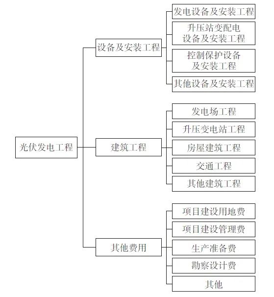 目前交能融合項目主要利用分布式光伏進行發(fā)電,同時可以加以配套充電樁、儲能和分布式風(fēng)機等裝置。投資估算依照《光伏發(fā)電工程設(shè)計概算編制規(guī)定及費用標(biāo)準(zhǔn)》(NB/T32027—2016),包括項目劃分及費用構(gòu)成等,具體如下圖所示。