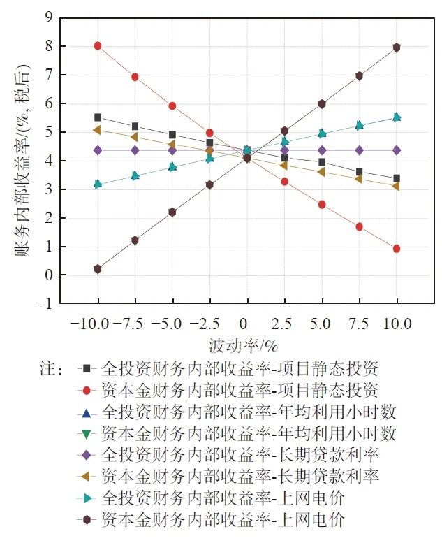 考慮到當(dāng)前選用經(jīng)濟評價的部分重要參數(shù)存在不確定性,具有一定風(fēng)險。因此本文以主方案為例,選取項目靜態(tài)投資、年均利用小時數(shù)、長期貸款利率、上網(wǎng)電價、自用電比例等參數(shù)進行敏感性分析,結(jié)果如下圖所示。