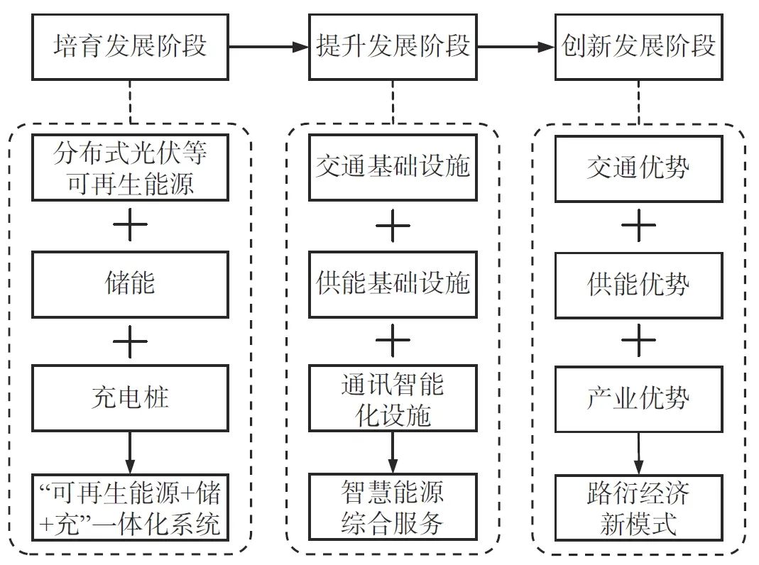 根據(jù)我國交通領(lǐng)域和能源領(lǐng)域的發(fā)展現(xiàn)狀和趨勢,交能融合模式發(fā)展路徑可分為3個階段,如下圖所示: