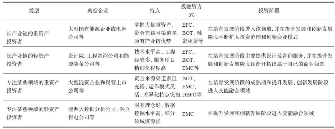 本文基于資產(chǎn)結(jié)構(gòu)和產(chǎn)業(yè)鏈延伸度將交能融合項目的投資者分為長產(chǎn)業(yè)鏈的重資產(chǎn)投資者、長產(chǎn)業(yè)鏈的輕資產(chǎn)投資者、專注某些領(lǐng)域的重資產(chǎn)投資者、專注某些領(lǐng)域的輕資產(chǎn)投資者。不同類型的投資者具有相應(yīng)的特點和投融資方式,并在不同發(fā)展階段進入交能融合領(lǐng)域,具體如下表所示。