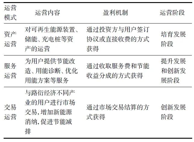 根據(jù)交能融合項目運營內(nèi)容的不同,分為資產(chǎn)運營及盈利機制、服務(wù)運營及盈利機制和交易運營及盈利機制。交能融合商業(yè)模式不同發(fā)展階段的運營方式及利益來源如下表所示: