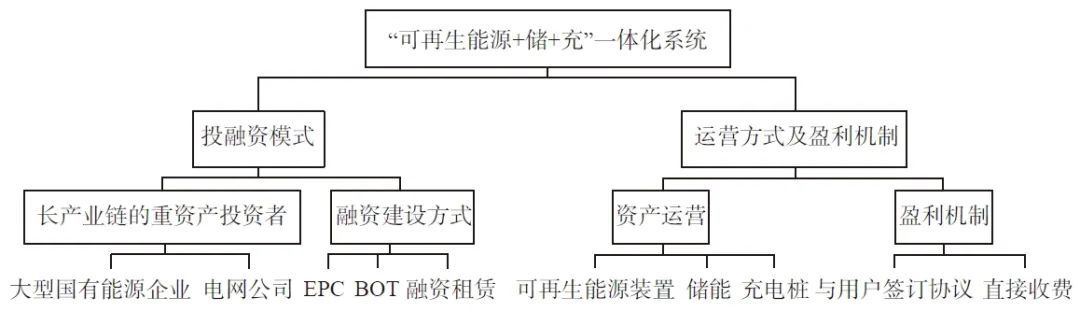 針對在高速公路服務(wù)區(qū)建設(shè)“可再生能源+儲+充”一體化系統(tǒng)的項目,長產(chǎn)業(yè)鏈的重資產(chǎn)投資者通過EPC、BOT、融資租賃等方式進行融資建設(shè),利用可再生能源裝置、儲能、充電樁等資產(chǎn)為用戶提供電能,余電上網(wǎng),并通過與用戶簽訂協(xié)議或直接收費的方式獲得運營收益。場景內(nèi)容具體如下圖所示。