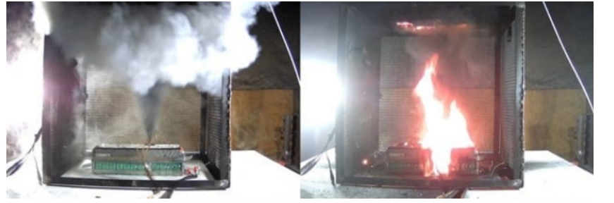 圖2 UL研究所進行的鋰離子電池濫用/點火測試,其中左側是電池冒煙,右側是電池燃燒