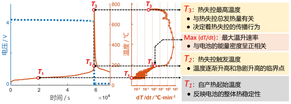 鋰離子電池?zé)崾Э氐恼T因可分為:機(jī)械濫用、電濫用和熱濫用。3種濫用方式可獨(dú)立發(fā)生,但也存在一定因果關(guān)系。在熱失控過程中,電池內(nèi)部主要發(fā)生:固體電解質(zhì)(SEI)膜分解、正/負(fù)極-電解液反應(yīng)、隔膜融化、電解液分解和粘連劑分解等化學(xué)放熱反應(yīng),這些反應(yīng)并沒有嚴(yán)格的先后順序,熱失控機(jī)理如圖1所示。此外,研究人員利用加速量熱儀實(shí)現(xiàn)了對(duì)熱失控特性的定量分析,通過對(duì)多種不同類型電池進(jìn)行測(cè)試,總結(jié)出了熱失控的3個(gè)特征溫度T1、T2、T3和一個(gè)關(guān)鍵參數(shù)——最大溫升速率max{dT/dt},如圖2所示??傮w而言,單體電池?zé)崾Э胤揽氐哪繕?biāo)就是提高T1和T2,降低T3和max{dT/dt}。
