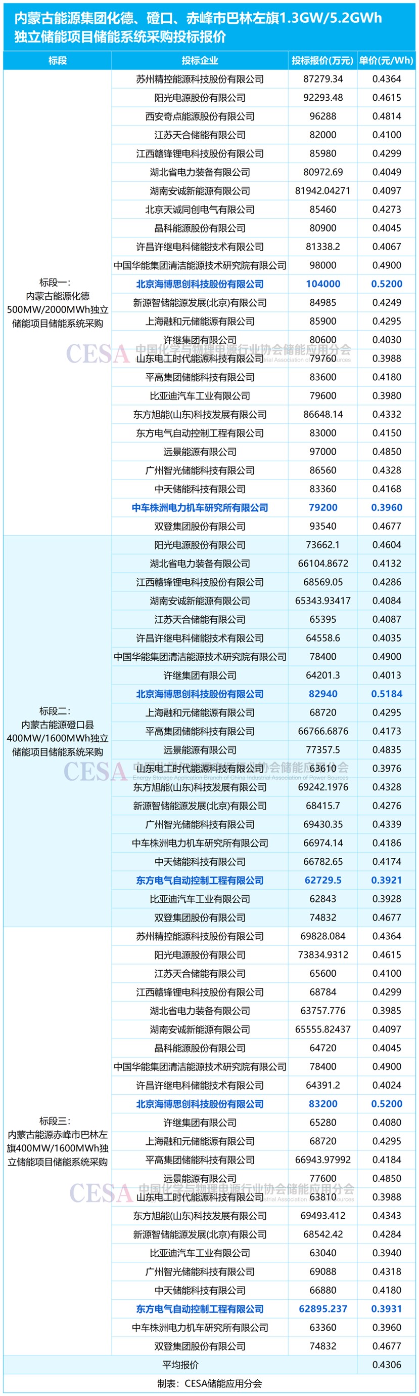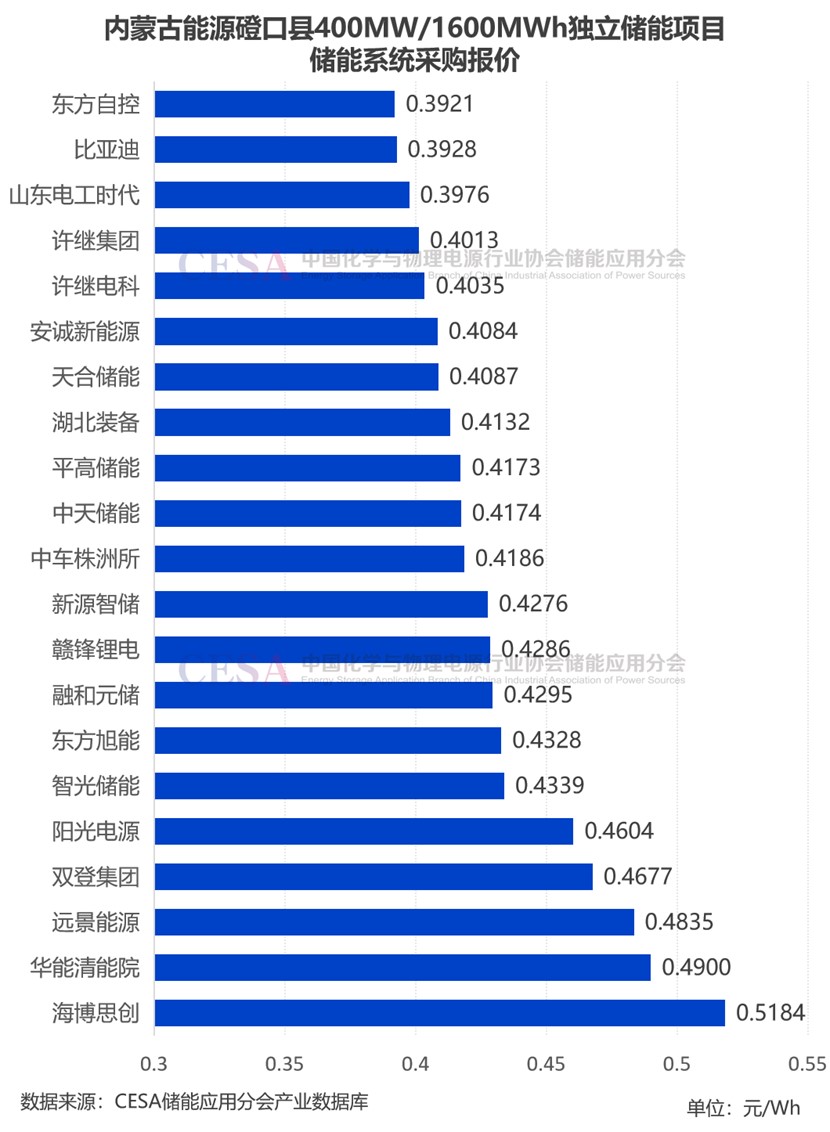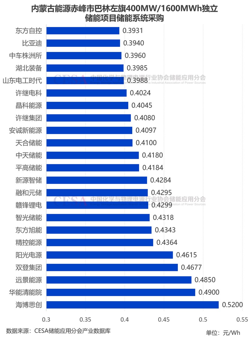 標段三共吸引了東方自控、比亞迪、中車株洲所、湖北裝備、晶科能源等23家企業(yè)競標,投標報價在0.3931-0.52元/Wh,平均報價0.429元/Wh。最低報價0.3931元/Wh來自于東方自控,最高報價0.52元/Wh來自于海博思創(chuàng)。