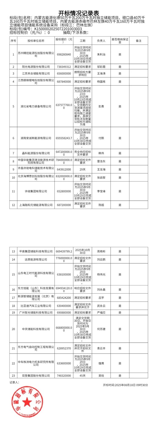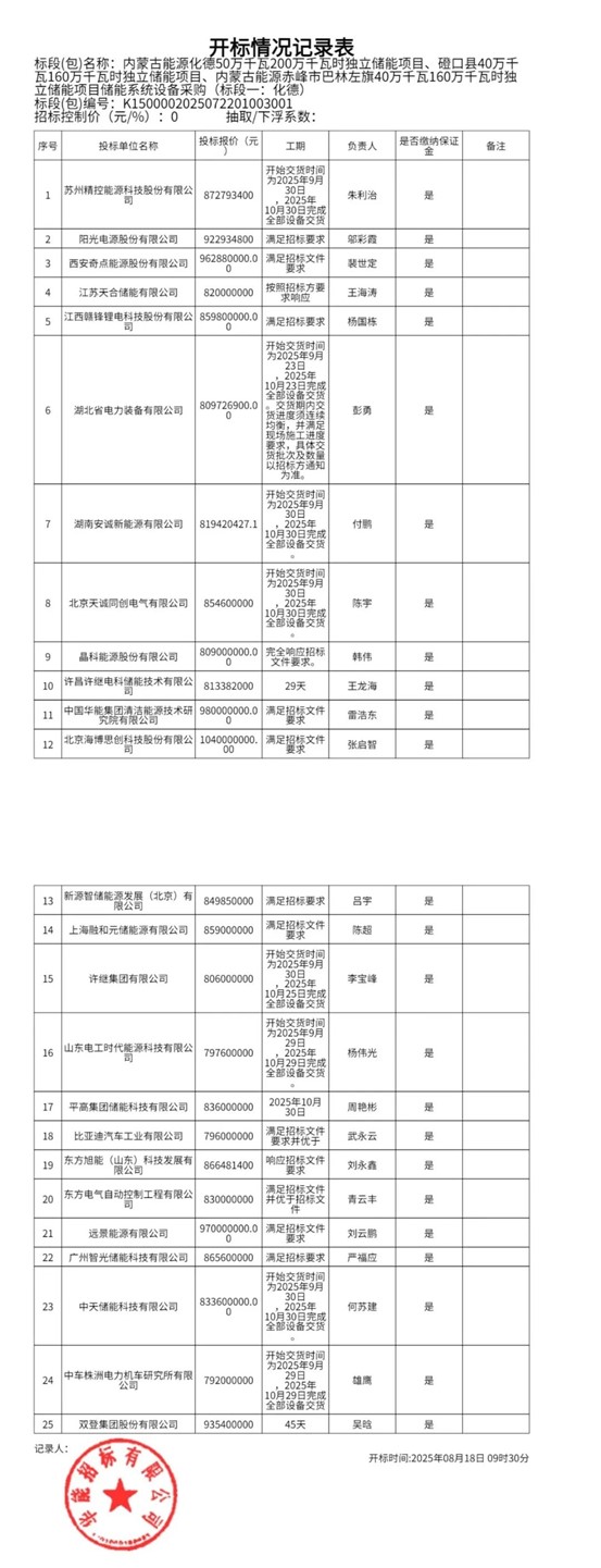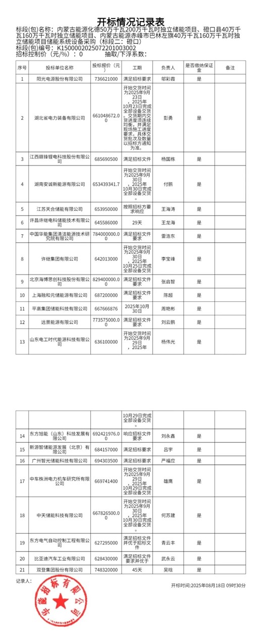 中國儲能網(wǎng)訊:2025年8月18日,內(nèi)蒙古能源化德50萬千瓦200萬千瓦時獨立儲能項目、磴口縣40萬千瓦160萬千瓦時獨立儲能項目、內(nèi)蒙古能源赤峰市巴林左旗40萬千瓦160萬千瓦時獨立儲能項目儲能系統(tǒng)設(shè)備采購開標。