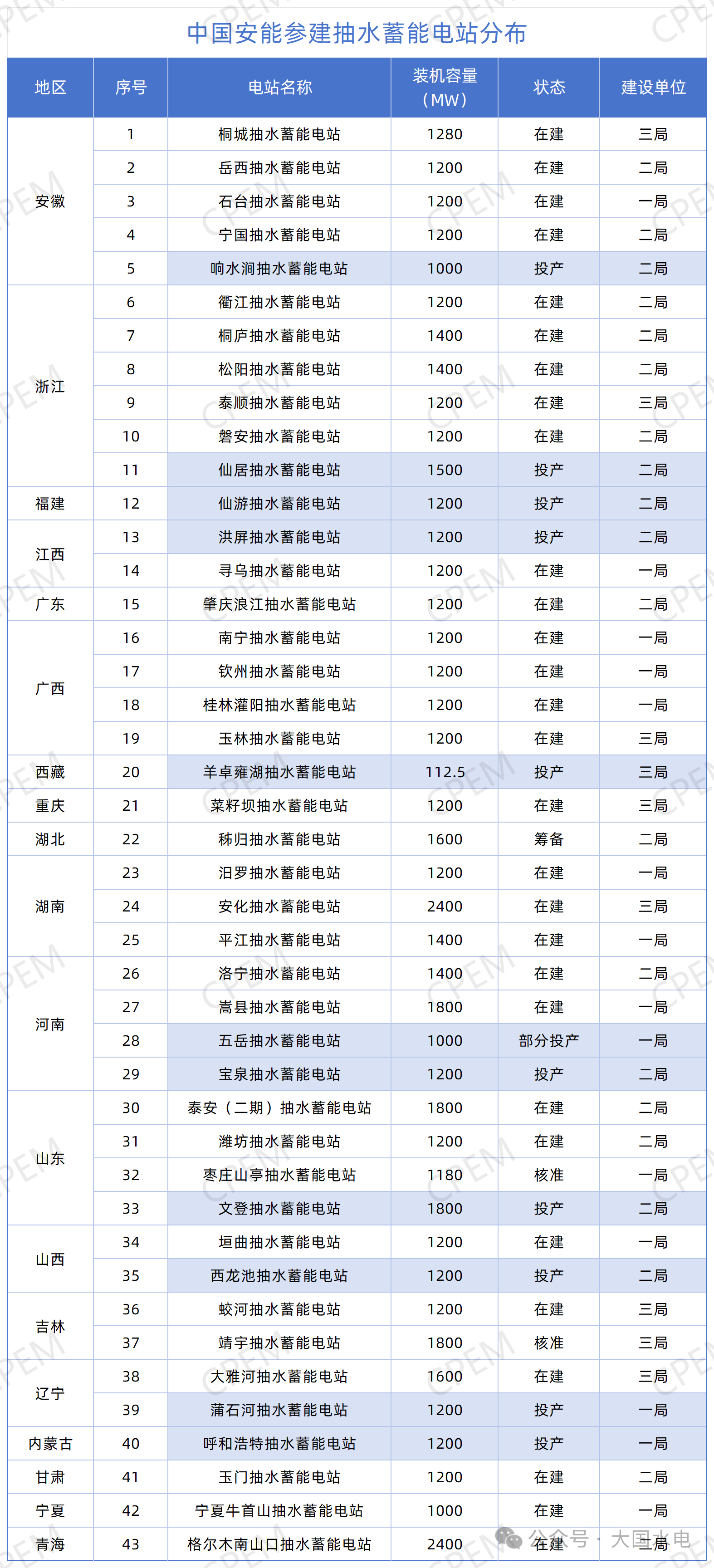 據(jù)CPEM大國(guó)水電統(tǒng)計(jì),截至2025年8月11日,中國(guó)安能參建/即將參建抽水蓄能電站43座,包括已投產(chǎn)/部分投產(chǎn)抽水蓄能電站11座,在建抽水蓄能電站29座,核準(zhǔn)/籌備抽水蓄能電站3座,如下: