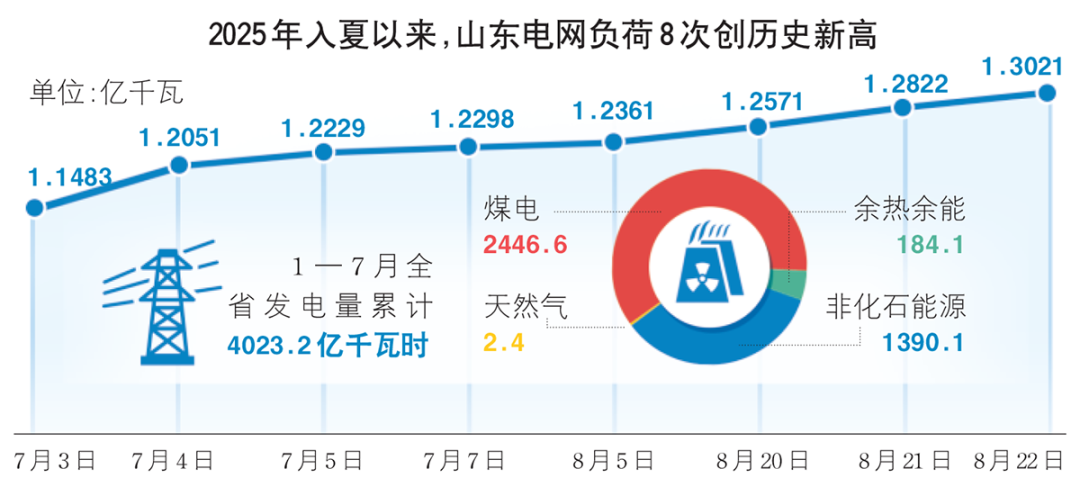 7月以來(lái),包括山東在內(nèi),全國(guó)多地出現(xiàn)多輪高溫,全國(guó)平均氣溫創(chuàng)1961年以來(lái)歷史同期新高。伴隨高溫天氣頻發(fā),全國(guó)多地迎來(lái)用電高峰。截至8月1日,全國(guó)最高用電負(fù)荷已四次創(chuàng)歷史新高,最高達(dá)到15.08億千瓦,較去年極值提高5700萬(wàn)千瓦。