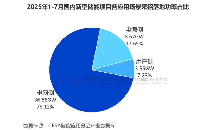 2025年1-7月,在49.1GW/137.65GWh采招落地的儲能項目中(不含集采/框采),電網(wǎng)側(cè)儲能項目定標規(guī)模36.88GW/101.37GWh,占比75.12%(功率)/73.64%(容量);電源側(cè)儲能項目規(guī)模8.67GW/26.78GWh,占比17.65%(功率)/19.45%(容量);用戶側(cè)儲能項目規(guī)模7.23%(功率)/6.90%(容量)。