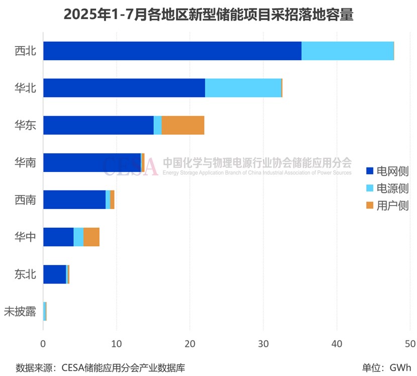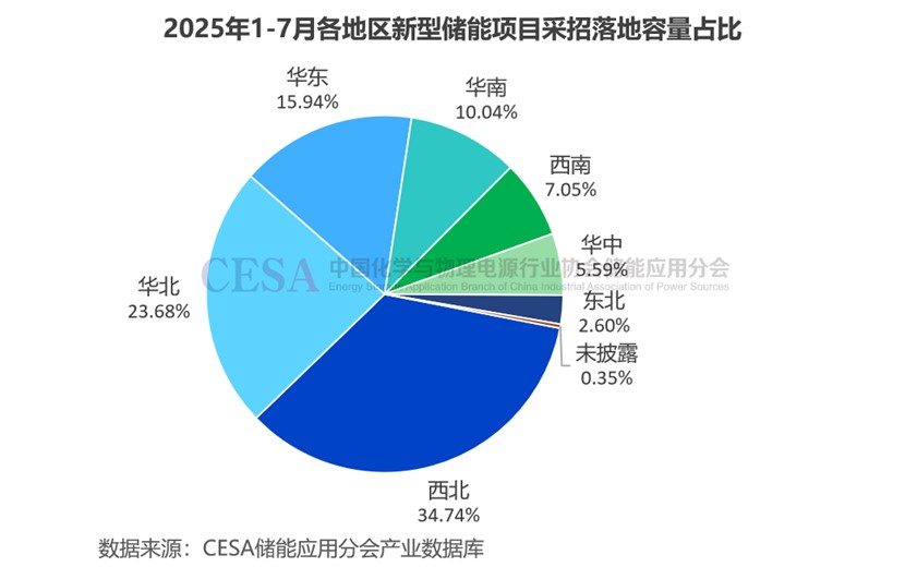 據(jù)CESA儲能應(yīng)用分會產(chǎn)業(yè)數(shù)據(jù)庫不完全統(tǒng)計,2025年1-7月在49.1GW/137.65GWh采招落地的儲能項目中(不含集采/框采),西北地區(qū)采招落地規(guī)模最大,達14.27GW/47.82GWh,占比29.07%(功率)/34.74%(容量),主要為源網(wǎng)側(cè)項目。