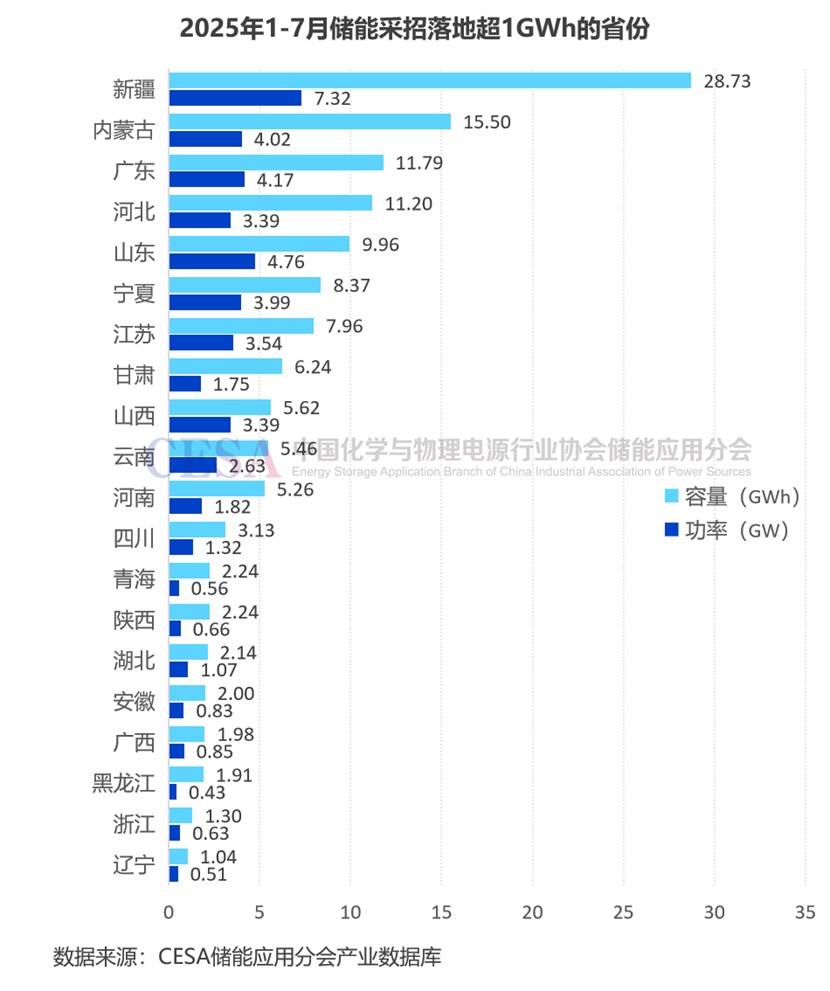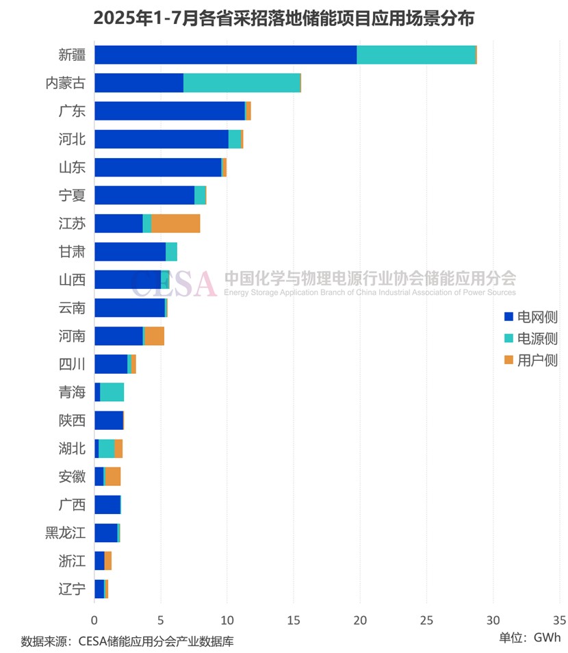 據(jù)CESA儲能應(yīng)用分會產(chǎn)業(yè)數(shù)據(jù)庫不完全統(tǒng)計,2025年1-7月在49.1GW/137.65GWh采招落地的儲能項目中(不含集采/框采),新疆采招落地7.32GW/28.73GWh,位居全國首位,占比14.90%(功率)/20.87%(容量),主要為源網(wǎng)側(cè)項目,電網(wǎng)側(cè)采招落地19.74GWh,電源側(cè)采招落地8.95GWh,源側(cè)和網(wǎng)側(cè)規(guī)模均居全國之首。