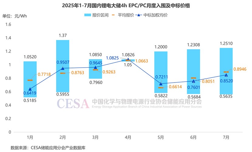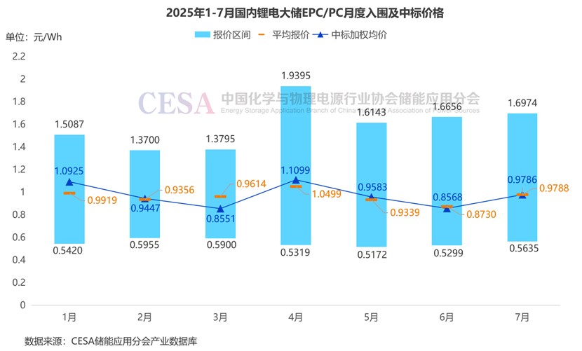 據(jù)CESA儲能應(yīng)用分會產(chǎn)業(yè)數(shù)據(jù)庫不完全統(tǒng)計,2025年1-7月,鋰電儲能EPC/PC采招落地項目入圍報價主要集中在0.5172-1.9395元/Wh區(qū)間內(nèi),平均報價1.006元/Wh,中標加權(quán)均價0.9753元/Wh。