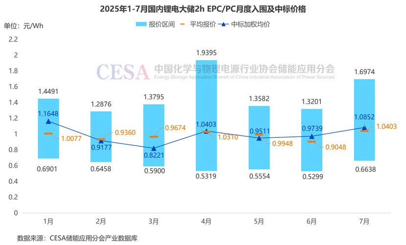 2025年1-7月,2h鋰電儲能EPC/PC入圍報價主要集中在0.5299-1.9395元/Wh區(qū)間內(nèi),平均報價1.0207元/Wh,中標加權(quán)均價1.0393元/Wh。最低報價來自于寶坻九園工業(yè)園區(qū)多能互補示范項目(風電)37MW(74MWh)配套儲能PC總承包工程,2025年6月許昌許繼電科儲能技術(shù)有限公司以3921.06萬元的報價中標,折合單價0.5299元/Wh。