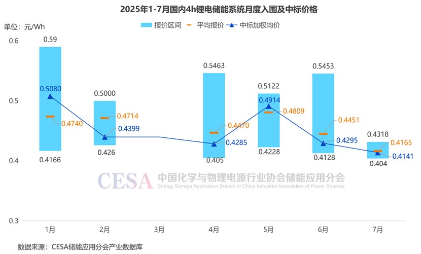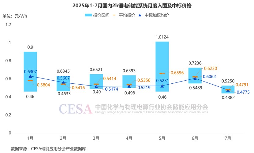 據(jù)CESA儲能應(yīng)用分會產(chǎn)業(yè)數(shù)據(jù)庫不完全統(tǒng)計,2025年1-7月,鋰電儲能系統(tǒng)(不含工商業(yè)儲能柜)采招落地項目入圍報價主要集中在0.404-1.0124元/Wh區(qū)間內(nèi),平均報價0.5327元/Wh,中標加權(quán)均價0.4849元/Wh。