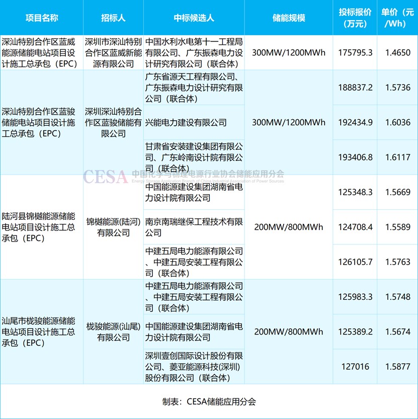 最低報價來自于深汕特別合作區(qū)藍威能源儲能電站項目設(shè)計施工總承包(EPC),2025年5月,中國水利水電第十一工程局有限公司、廣東振森電力設(shè)計研究有限公司以175795.3412萬元的報價中標,折合單價1.465元/Wh。