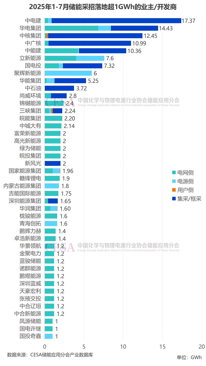 2025年1-7月,中電建、華電集團、中核集團、中廣核、中能建5大集團采招落地均超過10GWh,這5家集采/框采總規(guī)模超過50GWh。
