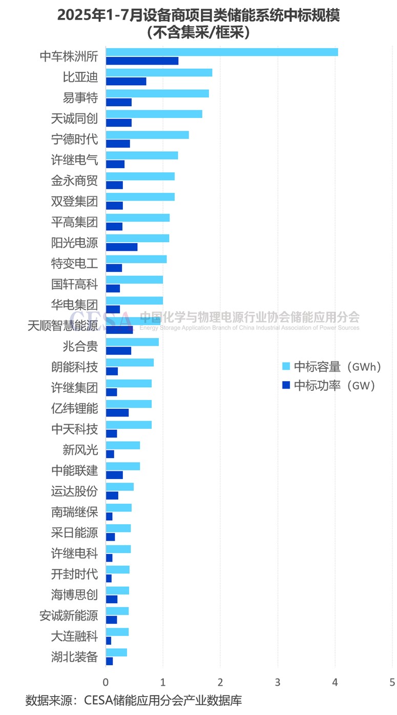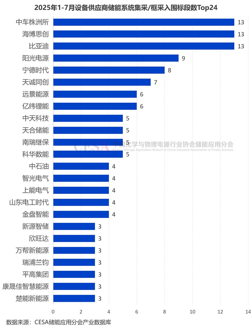 2025年1-7月儲能系統(tǒng)(含直流側(cè))集采/框采入圍標段數(shù)量最多的是比亞迪、海博思創(chuàng)、中車株洲所,均達到13個。
