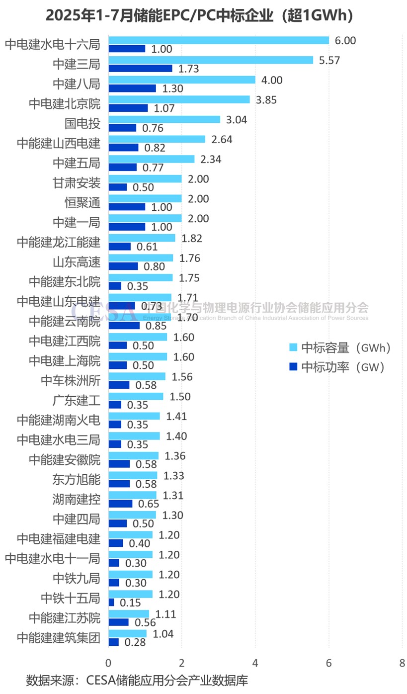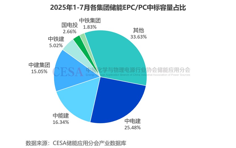 從集團層面分析,2025年1-7月,中電建儲能EPC/PC中標規(guī)模最大,達8.84GW/29.13GWh,容量占比25.48%。