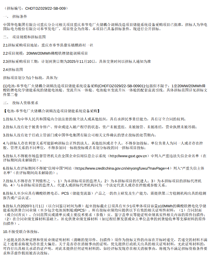 中國儲能網(wǎng)訊:8月22日,中國華電集團有限公司重慶分公司相關(guān)項目重慶奉節(jié)電廠火儲耦合調(diào)頻改造項目儲能系統(tǒng)設(shè)備采購-招標(biāo)公告發(fā)布。采購范圍包括但不限于1套20MW/20MWh磷酸鐵鋰電化學(xué)儲能系統(tǒng)的儲能電池艙、變流升壓一體艙、電池艙至變流升壓一體艙的配套直流引線。