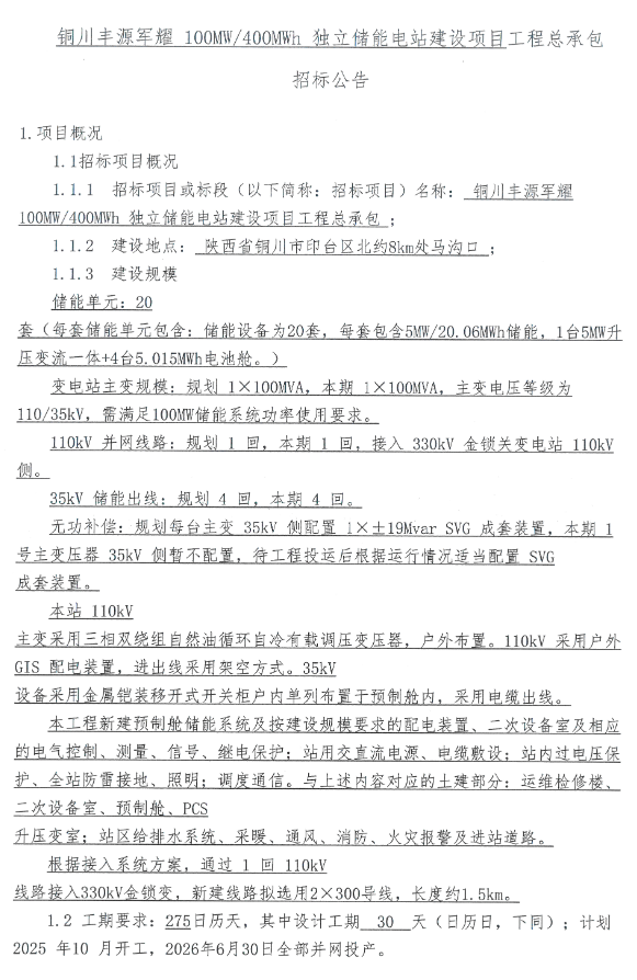 中國儲能網(wǎng)訊:8月22日,陜西豐源軍耀新能源有限公司發(fā)布銅川豐源軍耀 100MW/400MWh 獨立儲能電站建設(shè)項目工程總承包招標公告。項目位于陜西省銅川市印臺區(qū),儲能規(guī)模100MW/400MWh,共包括儲能單元20套(每套儲能單元包含5MW/20.06MWh儲能,1臺5MW壓變流一體+4臺5.015MWh電池艙。)